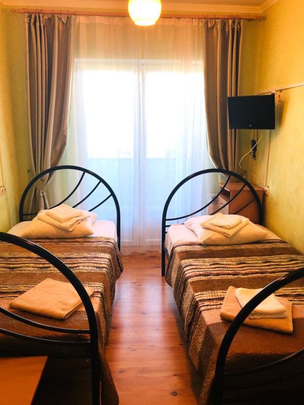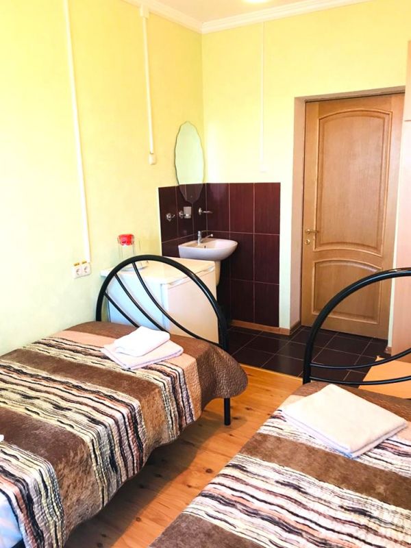 Площадь номера - 10-12 кв.м. 2 осн. места. Балкон. Мебель: вешалка, зеркало, кровати односпальные /одна двуспальная кровать, прикроватные тумбочки, стулья, шкаф. Оборудование: телевизор, холодильник. Санузел и душевые на этаже. Сервис: Wi-Fi бесплатно, смена полотенец (1 раз в 6 дней, по требованию), смена постельного белья (1 раз в 6 дней, по требованию), уборка номера (ежедневно).